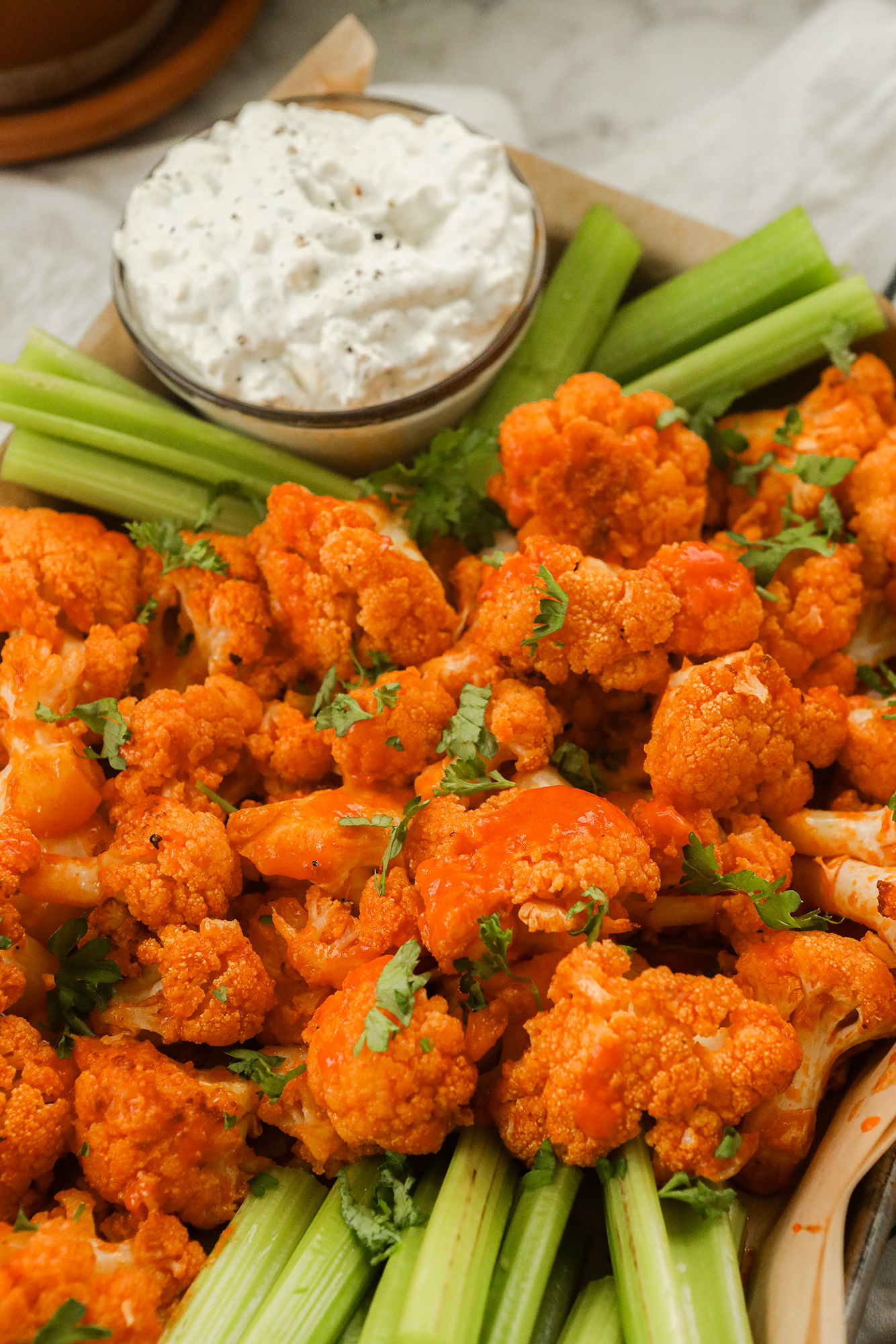 Roasted Buffalo Cauliflower Recipe with Blue Cheese Dip