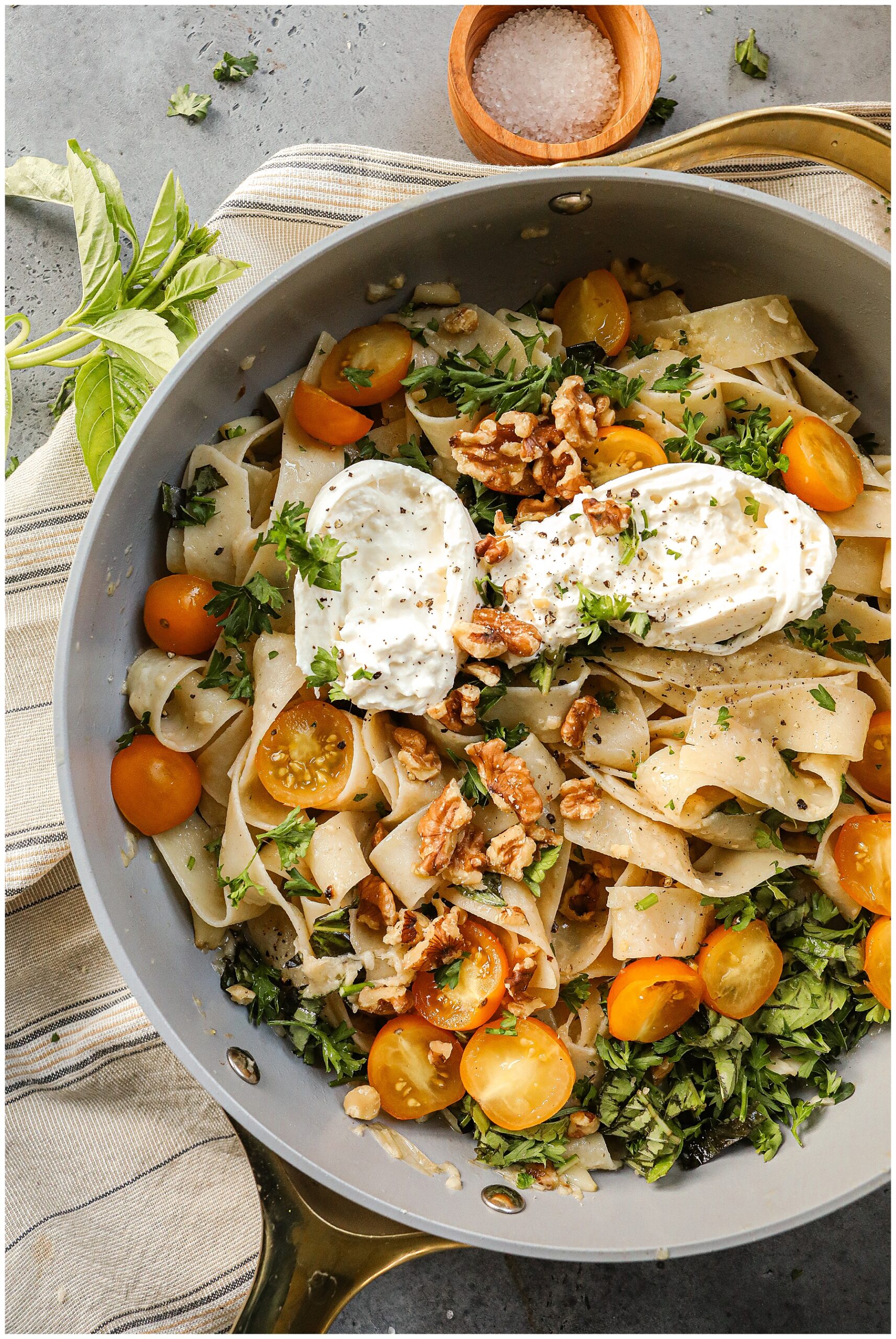 Once again, calling all pasta lovers. Filled with fresh, savory garlic, herbs, and cheese, it’s a big bowl of comfort as the seasons begin to change on us. The tomato and burrata is sure to make your mouth water. Click {HERE} for the detailed recipe.