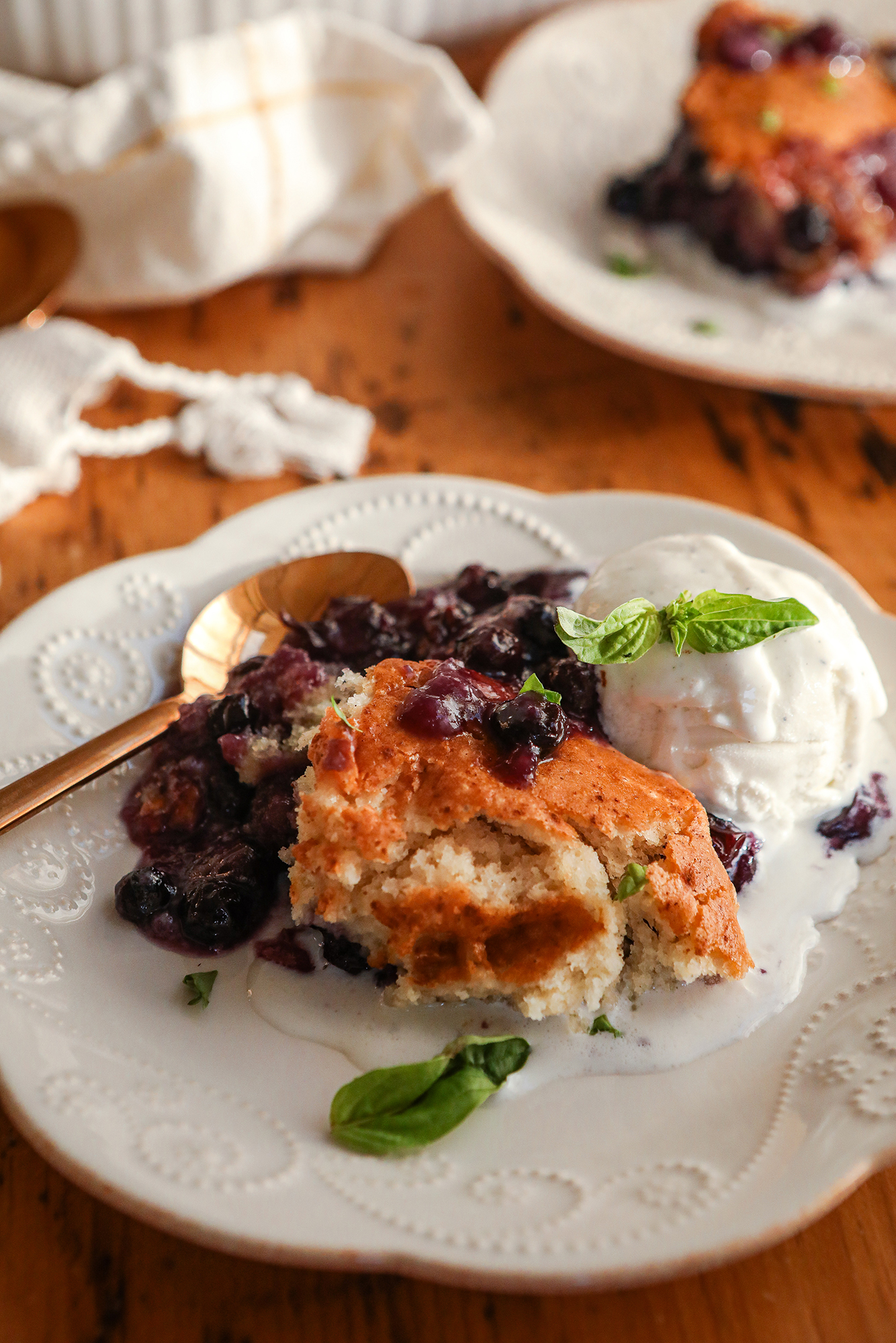 - Serve warm out of the oven with a scoop of vanilla bean ice cream and chopped, fresh basil as a garnish or another sprinkle of cinnamon.