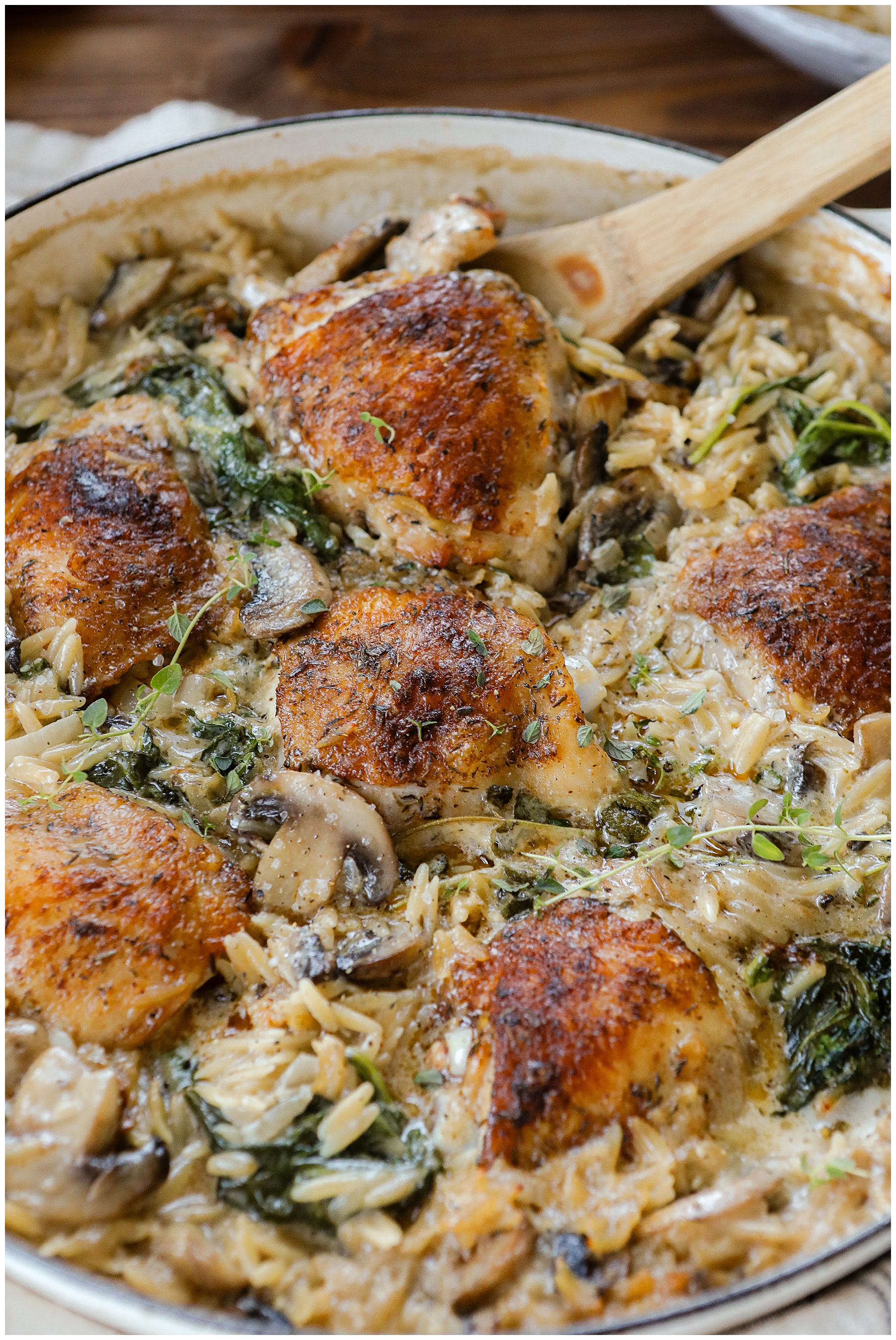 My Parmesan Mushroom Orzo recipe with chicken is really made in three parts and is a true one-pan meal. First, the seasoned chicken is cooked in the pan with extra virgin olive oil. Once both sides have been decently seared, the chicken is removed. Next, the orzo base is created with shallots, garlic, the mushrooms, butter, white wine and chicken broth. The orzo gets simmered in all of this and then heavy cream, fresh herbs, parmesan and spinach is added. This part of the recipe is a little more hands on but it is worth it. Last, the chicken is added back to the pan and then the whole thing is baked to finish off cooking the chicken and the orzo. This also allows the chicken to continue to flavor the pasta and the white whine, cream and chicken stock to help keep the chicken moist.