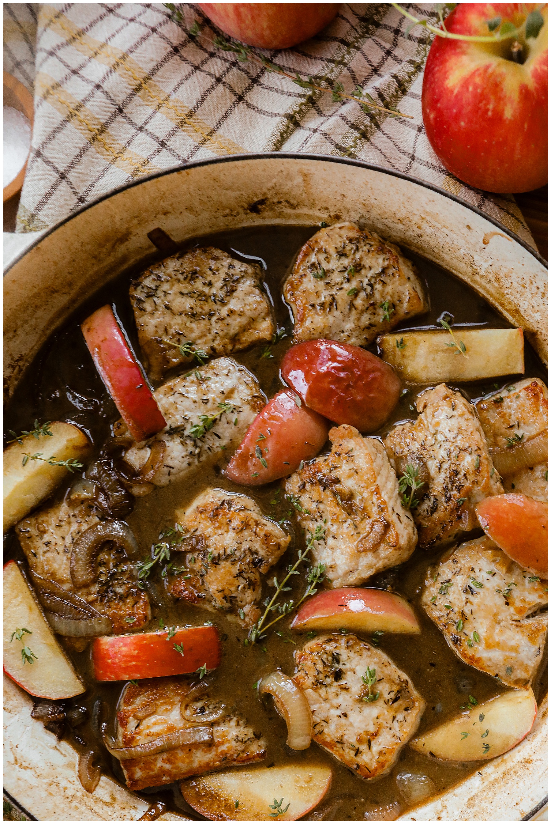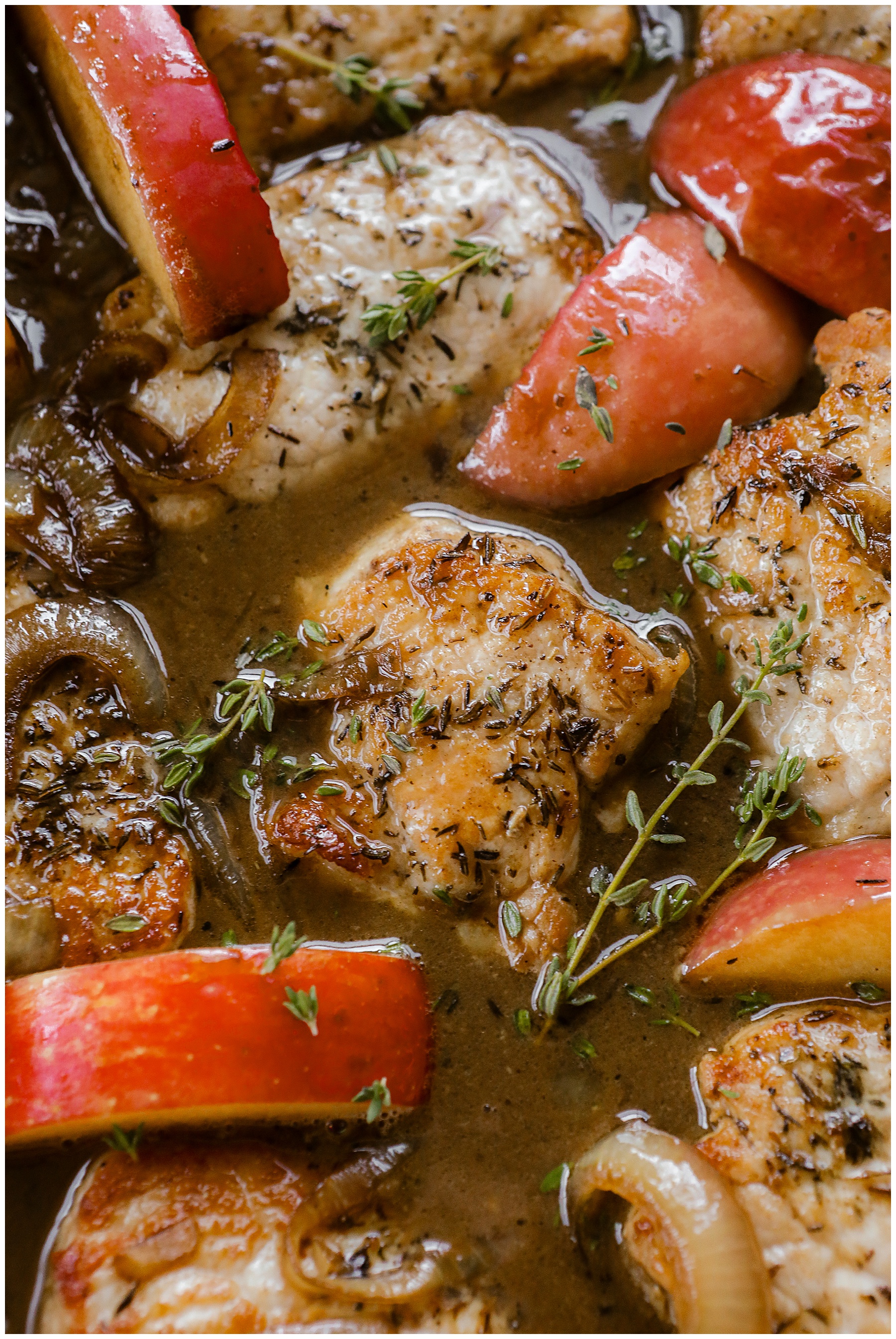 - Add the pork back to the pan plus any juices from the plate. Now add in the apples and fresh thyme. Tuck them between the pork. Make sure they are at least partly in the juice. Simmer for 5 minutes.