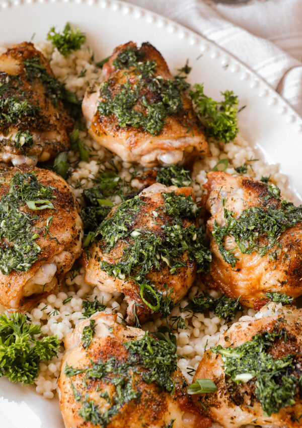 Crispy Oven Roasted Chicken Thighs with Spring Herbs