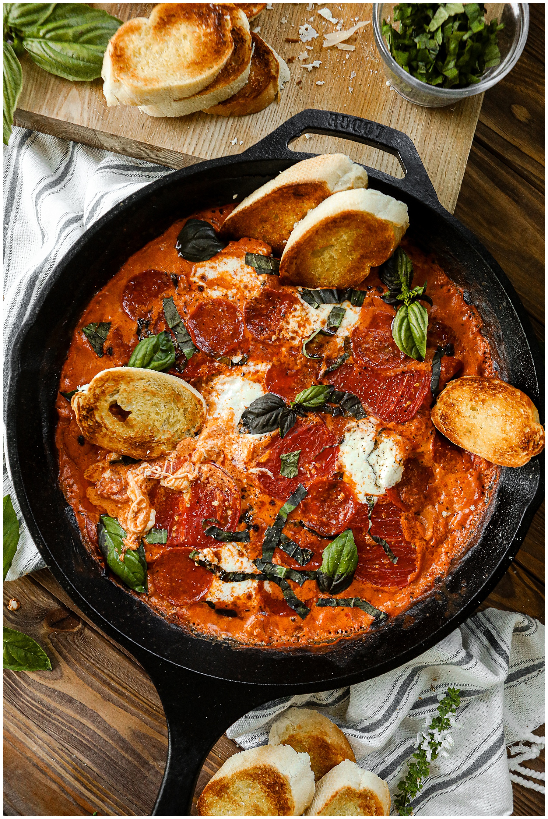 - Serve the Homemade Tomato and Pepperoni Pizza Dip with additional basil, salt and pepper to taste and crusty bread.